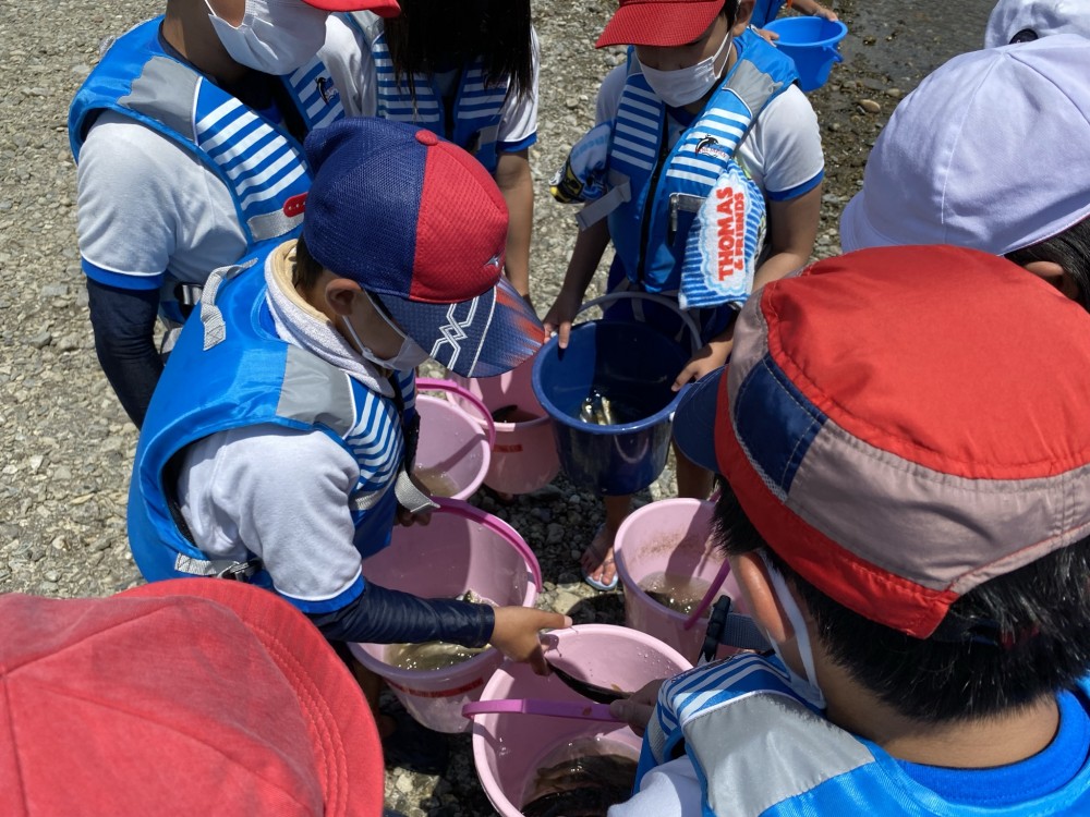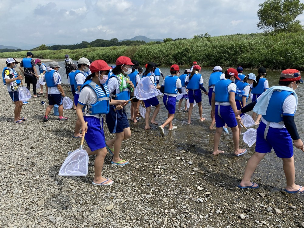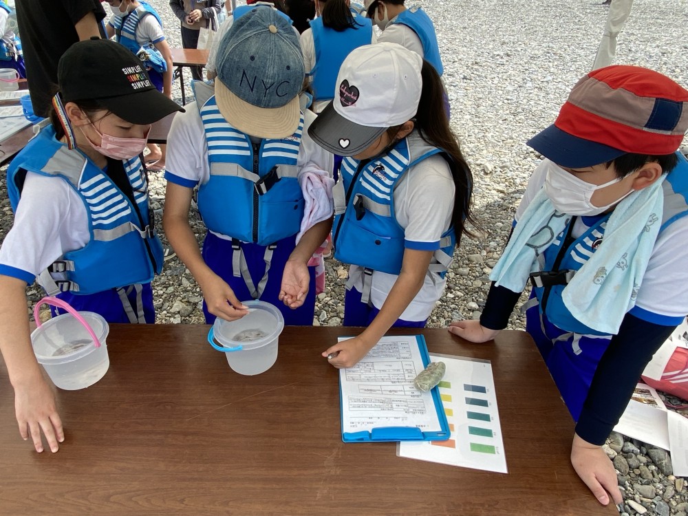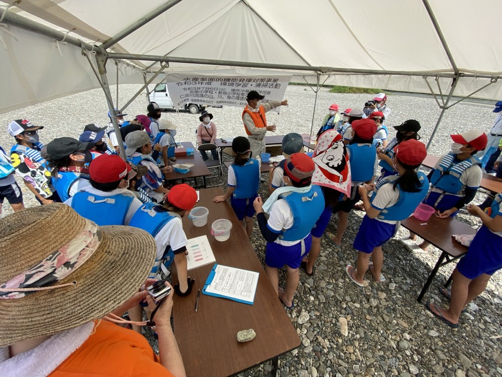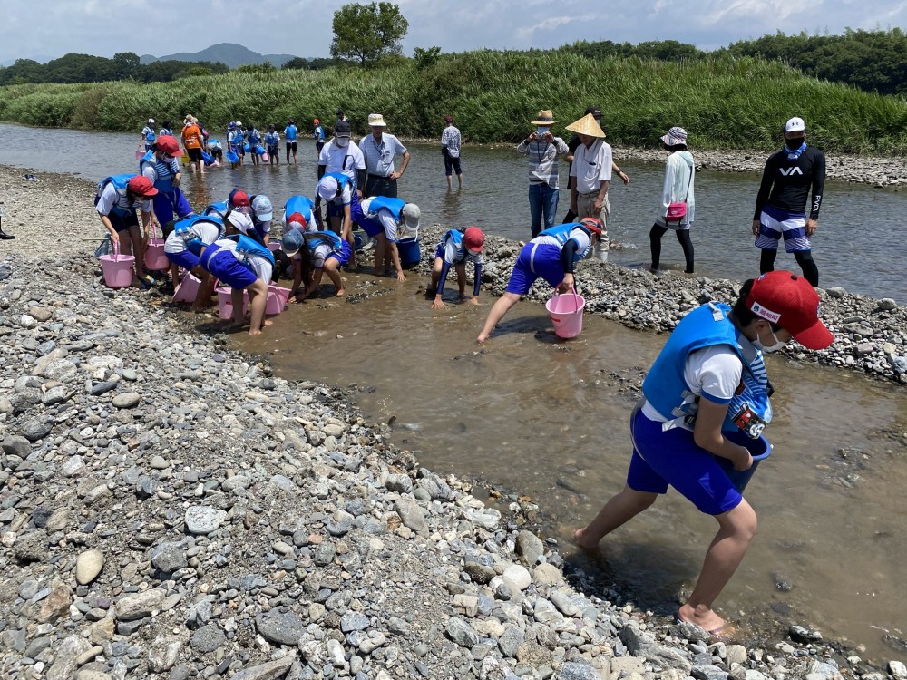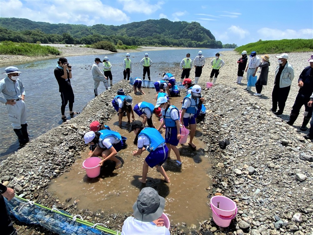当日は地域の北原小学校と新居小学校の5、6年生が参加し、仁淀川河川敷にて「水生生物の観察」や「河川の水質調査」をおこない、後半は「河川敷の一斉清掃」から「鮎の放流・つかみ取り」や「投網実演」をおこないました。