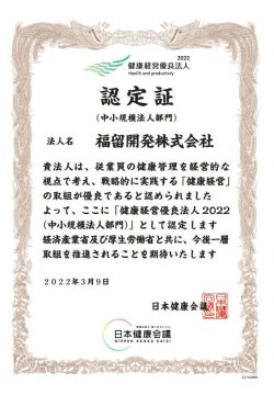 健康経営優良法人2022 認定 この度、当社は2021年に続き、経済産業省が支援する日本健康会議様より「健康経営優良法人2022(中小規模法人部門)」に認定いただきました。 健康経営優良法人認定制度とは、地域の健康課題に即した取組や日本健康会議が進める健康増進の取組をもとに、特に優良な健康経営を実践している大企業や中小企業等の法人を顕彰する制度です。 従業員の健康管理を経営的な視点で考え、戦略的に取り組んで行ける法人として、今後とも社会的に評価を受けることができる環境を整備して参ります。